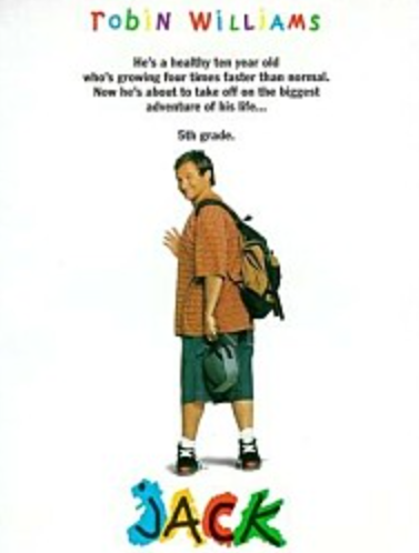 [잭]은 1996년 개봉한 미국의 코미디 드라마 영화이다. 영화는 잭 파월(윌리엄스 분)이라는 어린 소년이 정상인보다 4배나 빨리 늙는 희귀한 병을 가지고 태어난다는 이야기를 따라간다. 결과적으로, 그는 10살밖에 되지 않았는데도 마흔 살의 남자로 보인다. 이 영화는 잭이 처음으로 학교를 시작하는 것으로 시작하는데, 이것은 그가 다른 아이들과 신체적으로나 정서적으로 다르기 때문에 그에게 도전이다. 하지만 그는 선생님인 미스 마르케스(제니퍼 로페즈 분)와 그의 독특한 인생관에 매료된 반 친구들과 빠르게 친구가 된다. 잭은 나이가 들면서 자신의 상태와 자신이 오래 살지 못할 것이라는 사실을 점점 더 깨닫게 된다. 그는 세상에서 자신의 위치와 삶의 목적에 대해 의문을 품기 시작한다. 한편, 그의 부모 (다이앤 레인과 브라이언 커윈이 연기한)는 그렇게 희귀하고 쇠약한 상태의 아이를 키우는 어려움에 대처하기 위해 고군분투한다. 어려운 상황에도 불구하고, 잭은 긍정적인 태도를 유지하고 그의 삶을 최대한 활용하려고 노력한다. 그는 친구들과 가족들과 친밀한 유대감을 형성하고, 심지어 마르케즈 양을 짝사랑하는데, 마르케즈 양은 그녀의 직업적인 책임과 그에 대한 개인적인 감정 사이에서 갈팡질팡한다. 결국 잭은 지구에서의 시간이 제한되어 있다는 것을 깨닫고 남은 시간을 최대한 활용하기로 결심한다. 그는 고등학교 졸업식에 참석하여 진심 어린 연설을 하고 반 친구들과 그들의 가족들로부터 기립박수를 받는다.그 이후는 영화를 보고 많은것들을 생각해보자
